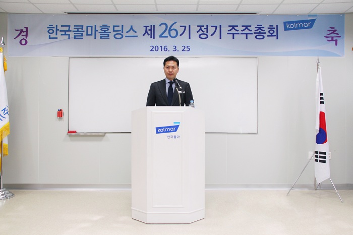 | 한국콜마·한국콜마홀딩스, 주주총회 개최 한국콜마(대표이사 윤동한)는 3월 25일 세종특별자치시 전의면 본사에서 임직원 및 주주들이 참석한 가운데 제4기 정기 주주총회를 개최했다. 이번 주주총회에서는 재무제표 및 연결재무제표 승인, 이사 선임과 이사 및 감사 보수한도 승인 등 총 4건의 안건을 승인했다. 한국콜마는 2015년 매출액 5,358억원(연결재무제표 기준), 영업이익은 607억원을 달성했으며, 결산배당은 주당 200원이다. 아울러 한국콜마홀딩스(대표이사 윤상현)도 같은 날 제26기 정기 주주총회를 가졌다. 한국콜마홀딩스는 지난 사업연도에 연결재무제표 기준으로 매출액 2,996억원, 영업이익 542억원을 달성했으며, 결산배당은 125원으로 최종 확정했다. 윤상현 대표는 인사말을 통해 “한국콜마홀딩스 및 관계사들은 어려운 경제 여건 속에서도 화장품 사업의 해외수출 비중 증대와 중국 제2공장 착공, 그리고 제약공장 증설을 통해 올해에도 성장을 멈추지 않을 것임을 약속 드린다”고 전했다. ▲ 한국콜마 최현규 대표이사가 25일 오전 세종특별자치시 전의면 한국콜마 본사에서 열린 한국콜마 제4기 정기 주주총회에서 의장을 맡아 발언하고 있다. ▲ 25일 오전 세종특별자치시 전의면 한국콜마 본사에서 열린 한국콜마홀딩스 제26기 정기 주주총회에서 의장을 맡은 윤상현 대표이사가 인사말을 하고 있다. |