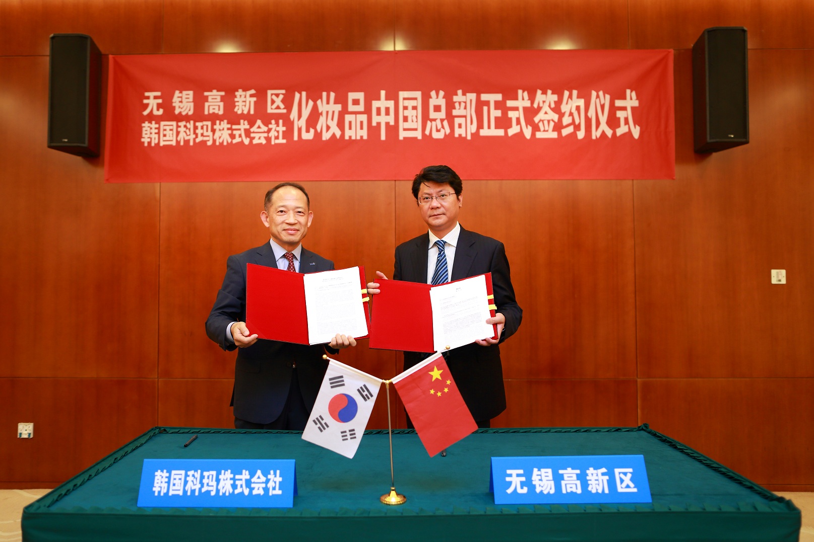 ▲ 6월 22일, 한국콜마 최현규 대표(왼쪽)와 무석신구 왕찐찌엔(王进健)부시장이 무석신구에 한국콜마 제2공장 구축과 관련한 정식 협약을 체결한 후 기념 촬영을 하고 있다. |